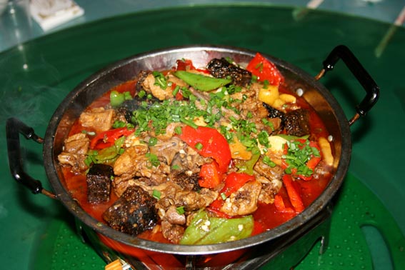 【 鳳凰血粑鴨子 】 血粑鴨子是鳳凰最具特色的地方菜之一,制作時(shí)將預(yù)先浸泡好的上等糯米裝入碗里,宰殺鴨子時(shí)將鴨血溶入糯米浸泡均勻。等鴨血凝固了,再蒸熟,放冷后,將血粑切成一小塊小塊的方塊,然后用菜油煎熟。待鴨肉煮九分熟時(shí),再將血粑放入鴨肉里烹煮,并摻合一定的香料物品,成金黃色即可,鴨子煮血粑既有鴨肉的鮮美味濃,又有血粑的清香糯柔,吃起來口感香濃,食欲大增,真是稀有的人間美味佳肴。