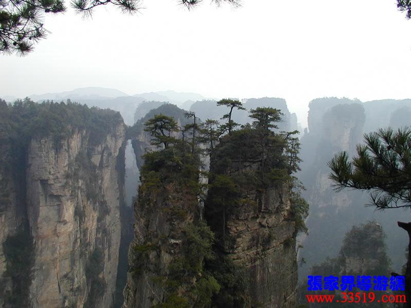 (天下第一橋)更多天下第一橋圖片>>>> 那就是“天下第一橋”。你們看,兩座山峰被一條長廊連在一起,形成天然橋洞,平時(shí)吞云吐霧,氣勢壯觀雄奇。橋面寬約兩米,長20余米,絕對高度357米。橋上蒼松挺拔,橋邊古藤垂掛,橋下深不可測。走在橋上,只見霧氣蒸騰,松濤呼嘯,石橋好像也顫顫悠悠,晃晃搖搖似的,令人驚心動(dòng)魄。這里是張家界風(fēng)景一絕,是大自然的一個(gè)奇跡。