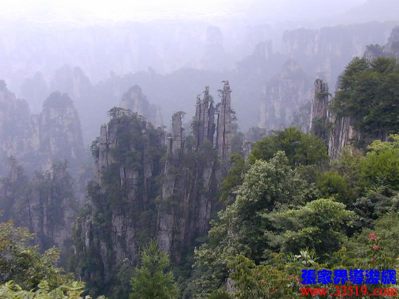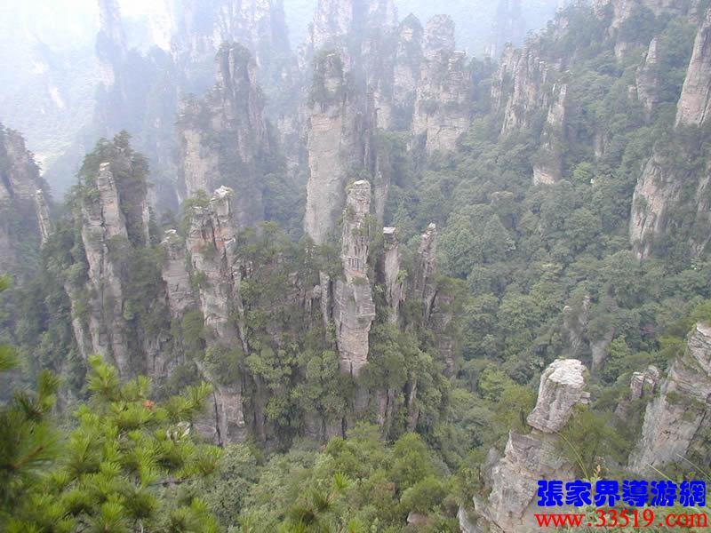 (大觀臺(tái))這就是大觀臺(tái)。極目遠(yuǎn)眺,千百座奇峰盡收眼底。一位詩人說,武陵源的砂巖峰林是一步一觀景,千步千造型,一山有四季,十步不同天。專家測算出武陵源石峰有3103座。一如一位高超的雕塑大師,模擬宇宙萬物,無不形狀逼真,維妙維肖,栩栩如生,呼之欲動(dòng)。有的如海螺出水,有的如金龜銜日,有的如蓮花盛開,有的如天橋橫空,有的如長槍刺天,有的如寶塔聳立,有的如老人采藥,有的如玉女梳妝,有的如將軍出征,有的如戰(zhàn)馬長嘯,有的如情人幽會(huì),有的如夫妻相擁,有的如仙女散花,有的如村姑守望.....有的孤峰獨(dú)秀,有的直插云霄,有的婷婷玉立,有的威武勇猛,有的小巧玲瓏,有的大氣磅礴。進(jìn)入武陵源,但見一片峰的森林,峰的世界,峰的海洋。挺拔、奇秀、集中、原始、粗獷、古野。這就是武陵源。一位藝術(shù)大師說:武陵源的山峰,改寫了山的概念。大攝影家陳勃說:“三山五岳堪比美,華夏風(fēng)光每一流。”王繼杰先生說:“武陵源上三日游,勝讀千篇李杜詩。”許世杰先生說:“秀幽險(xiǎn)峻稱奇絕,五岳黃山拜下風(fēng)。”李成瑞先生為此大抱不平:“神州勝景誰為最?須請霞公重評勘。”可惜徐霞客無緣到大觀臺(tái)來,也不可能為武陵源作甚評價(jià)了。