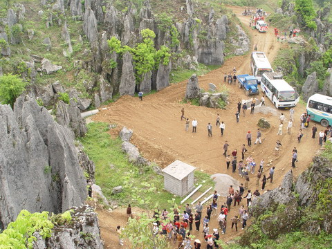 登上洛塔,只見連山綿谷,萬(wàn)石如林,一塊塊青灰色的大石頭競(jìng)高競(jìng)秀,競(jìng)美競(jìng)奇,綿亙縱橫,層疊交錯(cuò),造型奇特,塔狀、蓮臺(tái)狀、羅漢狀、錐狀、刀狀、箭簇狀、帷幕狀等林立薈萃,像一個(gè)個(gè)神奇的迷宮,組成洛塔地質(zhì)公園的旖旎景觀。有的玲瓏斫剔,若女繡工鐫;有的嶙峋怪異,如鬼斧神鑿;有的崢嶸巉峻,似水墨丹青;有的嵯峨兀立,藤蔓纏繞,更像一株株挺拔的古樹。高的、矮的、大的,細(xì)的。粗、瘦、皺、滑,各具特色,如人之面目相具而無(wú)一相似者,在綠樹紅花間亮麗起一道道迷人的風(fēng)景。洛塔石林遍及整個(gè)山界,較集中的有楠竹車水坪石林、梭洛趙家灣石林、八仙洞石林及公路沿線的銀河塔石林,僅車水坪一帶的石林面積就達(dá)1000多畝。無(wú)論其規(guī)模面積,造型及組合情況,洛塔石林都可與云南石林媲美。