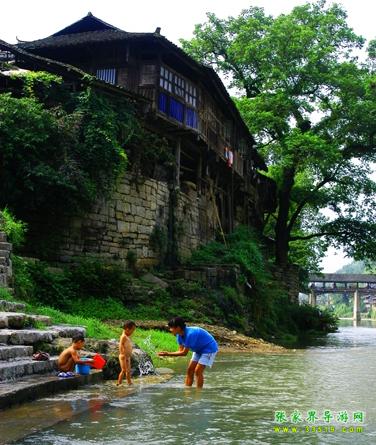民宅多為吊腳木樓,依山傍水而建,臨河者倒影澄潭如水中街市,依山者雄峙高崖似空中樓閣。兩條河潔凈透亮,其中小河尤為美麗,青山夾岸,綠水長(zhǎng)流,河畔蓼紅芷白,桂馥蘭芳,素有“香溪”之稱。其水盡來自溶洞,距街三里之內(nèi),就有魷魚洞、犀牛洞、王家洞、向家洞幾股洞泉和一個(gè)叫“雞屎潭”的溫泉。 “雞屎潭”來有濃重的硫磺味,水溫如沸,除污力極強(qiáng),根本不需肥皂便能將汗?jié)n洗得干干凈凈,并能醫(yī)治瘡疥,維護(hù)皮膚健康。河中多魷魚,肉嫩且肥,立冬前盡逆水潛入溶洞起冬,立夏前兩三天則成群結(jié)隊(duì)隨夏汛而出,鄉(xiāng)人在洞口安上網(wǎng)壕,只需“守株待兔”,便能得到豐盛的收獲。在20世紀(jì)70年代以前,有時(shí)每天可得幾百斤。 小河灘多流急,是漂流的極佳去處。