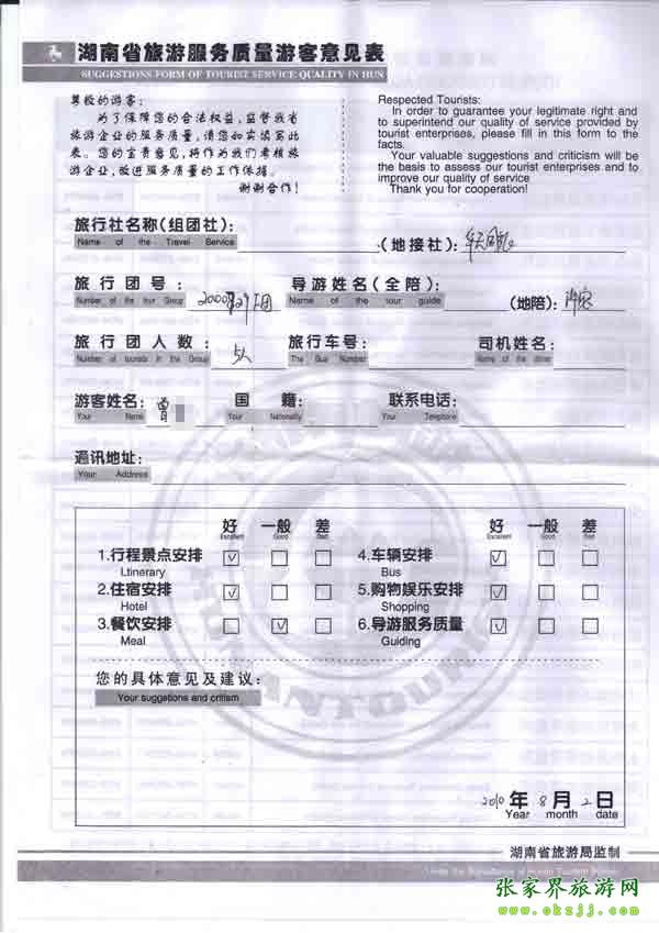 2010年8月2日曾小姐一行5位旅游質(zhì)量反饋