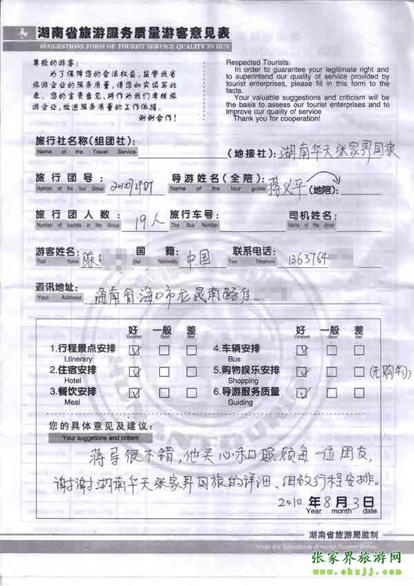 2010年8月3日海南陳小姐一行19位旅游質(zhì)量反饋