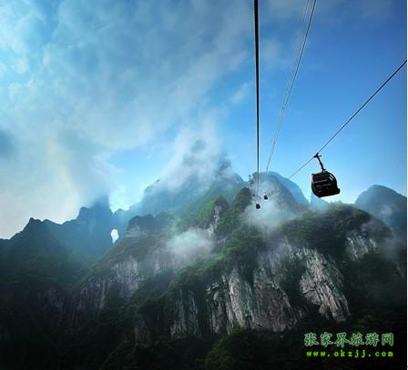 ![]() 天門(mén)山索道全長(zhǎng)7455米,水平高差1279米,是世界最長(zhǎng)的高山客運(yùn)索道。索道修建耗時(shí)2年,耗資2.5億人民幣,其中一段有著高達(dá)38°的爬坡角設(shè)計(jì)在國(guó)內(nèi)乃至世界都極為罕見(jiàn)。整條索道以張家界市中心的城市花園為起點(diǎn),直達(dá)天門(mén)山頂?shù)脑伎罩谢▓@,猶如一道彩虹飛渡人間天上,又似一條巨龍騰翔素云蒼穹,依山籍壁,恢宏壯觀。索道沿途經(jīng)過(guò)現(xiàn)代城市風(fēng)光,秀美田園風(fēng)光以及雄奇高山風(fēng)光,堪稱(chēng)世界第一空中移動(dòng)觀景長(zhǎng)廊。