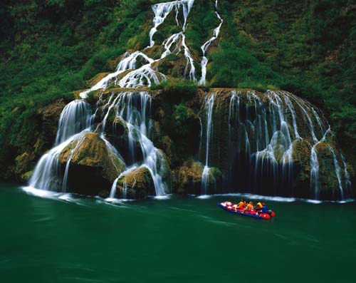 在金鞭溪游覽過(guò)程中,可見(jiàn)一組奇峰,有兩座較高的石峰緊密相連,下半截連為一體,上半截一高一矮,高者略欠身,低者稍后仰,好一幅相愛(ài)擁抱的絕妙畫(huà)面,恰似一對(duì)久別重逢的夫妻,故名相會(huì)峰,亦稱(chēng)千里相會(huì)。相傳東海龍宮小龍女常來(lái)此地觀賞風(fēng)景,一次偶然的機(jī)會(huì),結(jié)識(shí)了峨眉山遠(yuǎn)道而來(lái)的后生,二人情投意合,很快便產(chǎn)生了愛(ài)情。龍王知道此事以后,非常惱怒,決意拆散二人,多次將小龍女關(guān)在龍宮,但小龍女想方設(shè)法逃出來(lái),常常與情人相會(huì)。龍王一氣之下,將二人點(diǎn)化成石,便成石峰“千里相會(huì)”。 十一、茅巖河漂流