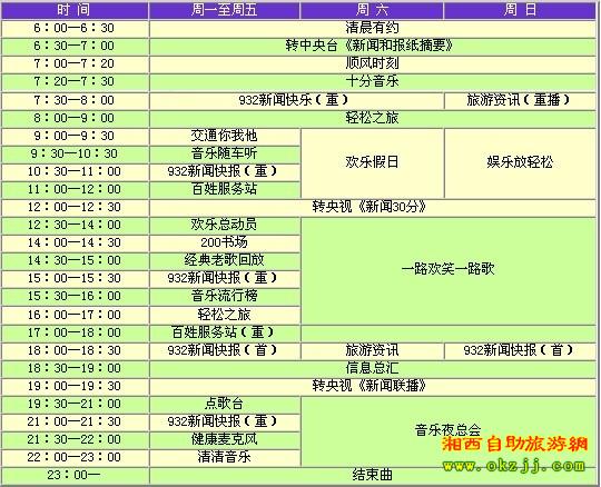 張家界旅游交通頻道茲定于四月八號試播,頻率為FM93.2兆赫和103.2兆赫。頻道以立足旅游交通、服務百姓大眾為宗旨,設置了《清晨有約》、《順風時刻》、《932新聞快報》、《輕松之旅》、《交通你我他》、《百姓服務站》、《歡樂總動員》和《音樂隨車聽》等欄目。屆時,聽眾可以通過熱線電話、短信平臺以及網絡廣播等多種途徑參與到電臺節(jié)目中來,在第一時間了解新聞動態(tài),掌握市場信息,享受娛樂休閑。 直播熱線:0744——2116999 熱線電話:0744——2116777 廣告熱線:0744——8235800 怎樣收聽張家界旅游交通頻道FM93.2